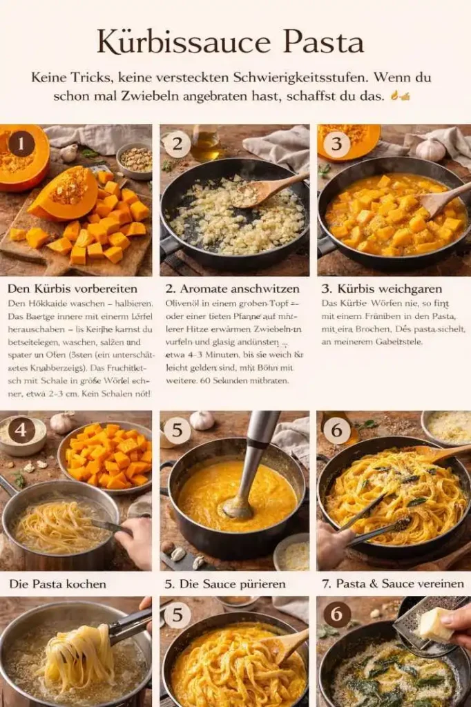 Kürbissauce Pasta ist für mich das Gegenstück zu einer wärmenden Umarmung auf dem Teller. Sie ist cremig, leicht süßlich, mit einer Tiefe, die man von einer so simplen Sauce gar nicht erwarten würde. Und das Beste? Du brauchst keine Kochschule, kein teures Equipment, und keine halbe Stunde Vorbereitungszeit. Ein halber Hokkaido, ein paar Zutaten aus dem Vorratsschrank – und du wirst sehen, dass Pasta im Herbst eine ganz neue Bedeutung bekommt.